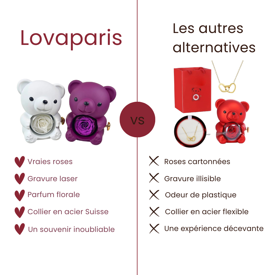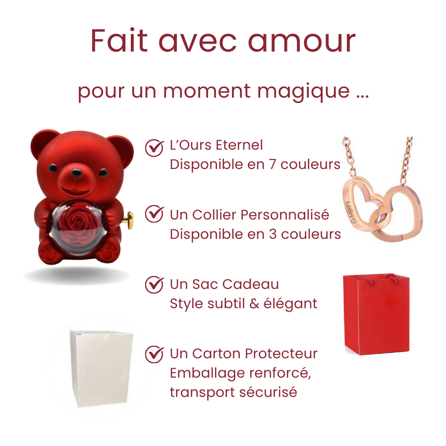 Notre coffret Ours à la Rose Éternelle renferme un collier personnalisé soigneusement dissimulé, pour un cadeau à la fois original et symbolique. Pensé pour durer, il incarne l’amour dans sa forme la plus intemporelle.