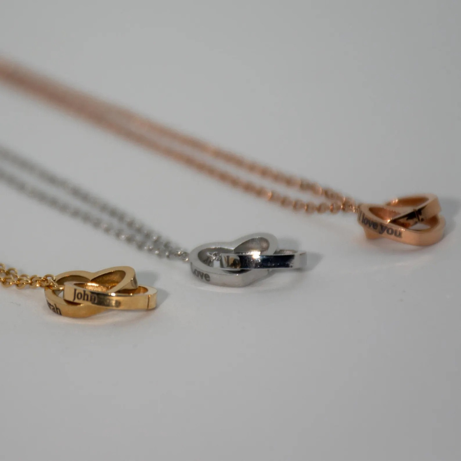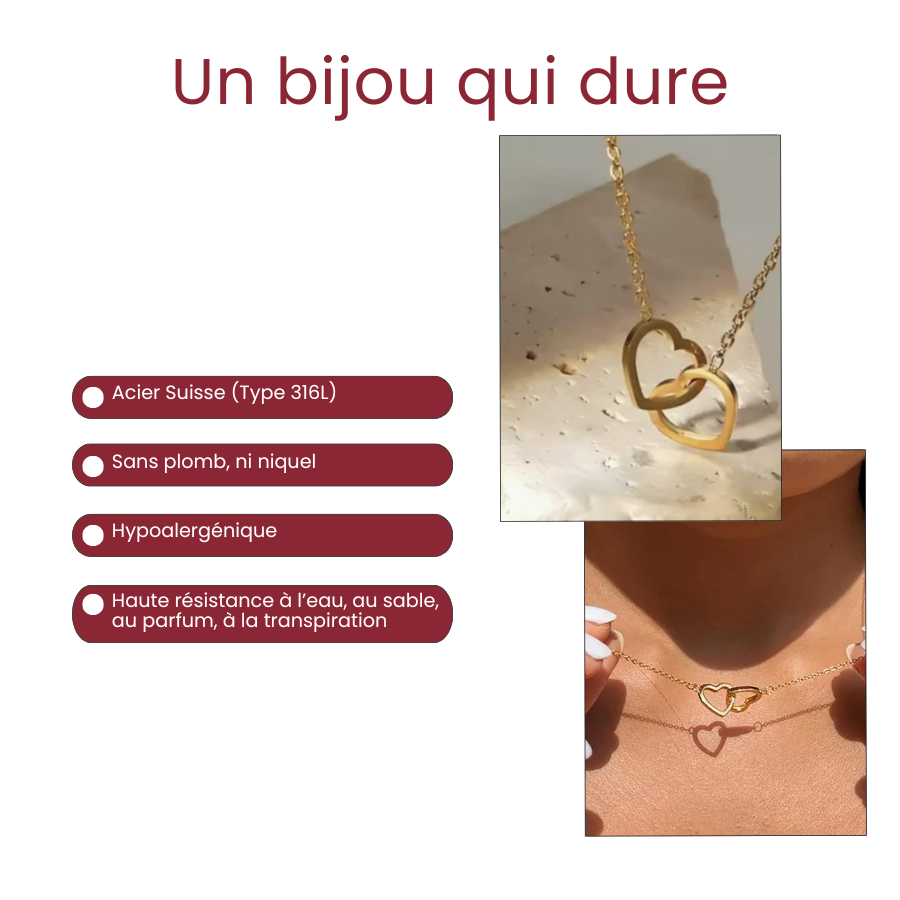 Oui ! Chaque bijou peut être gravé avec un prénom, une date ou un message spécial. Les deux cœurs entrelacés symbolisent votre lien unique, ce qui rend ce bijou vraiment personnel et significatif pour vous ou la personne à qui vous l’offrez.